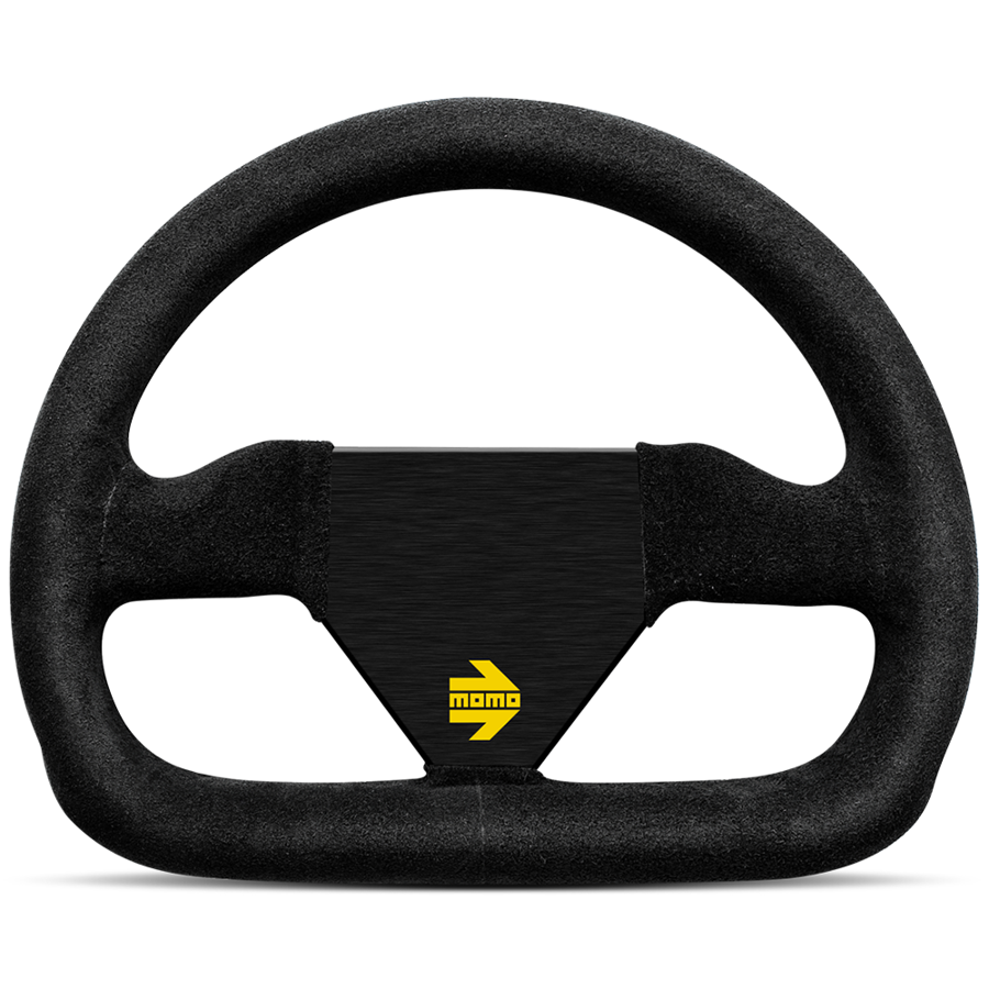 Het stuurwiel is afgewerkt in zwart suède en heeft zwarte aluminium armen met een plat middengedeelte en een geel MOMO-logo.