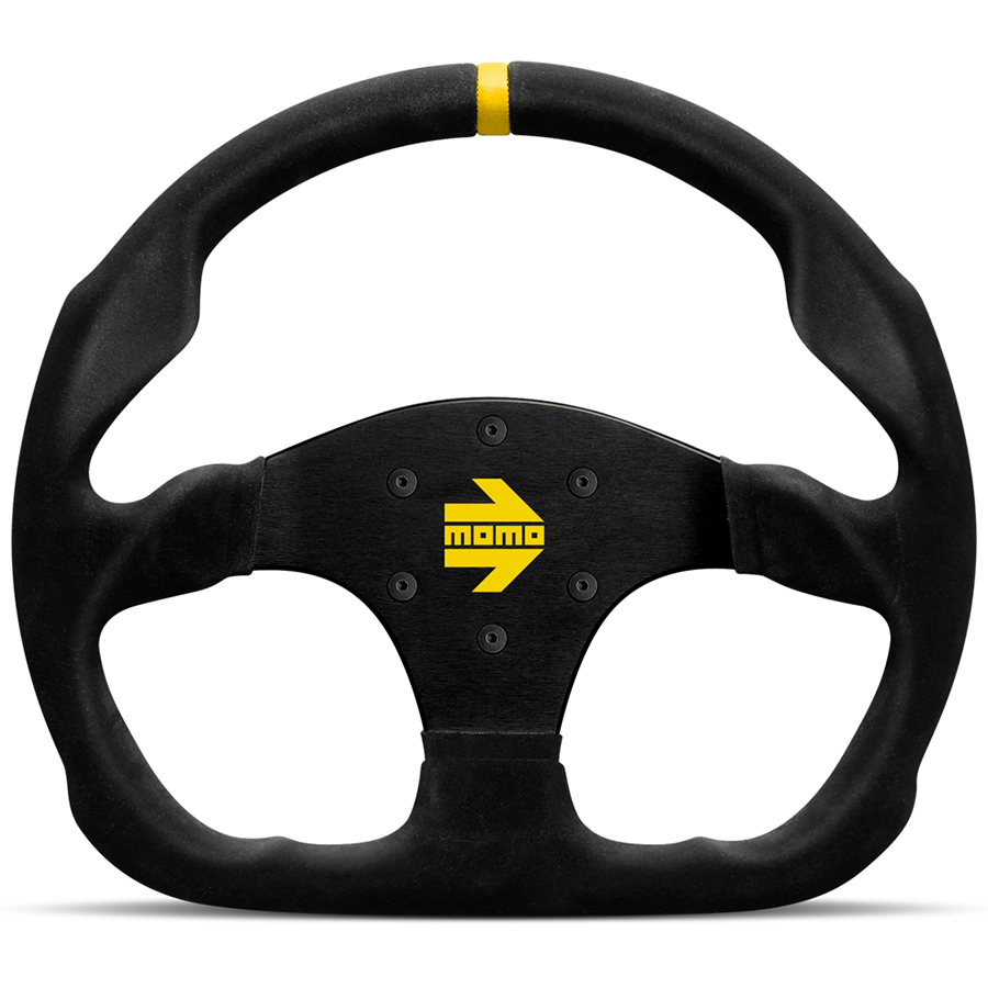 Het stuurwiel is afgewerkt in zwart suède en heeft zwarte aluminium armen met een geel MOMO-logo.