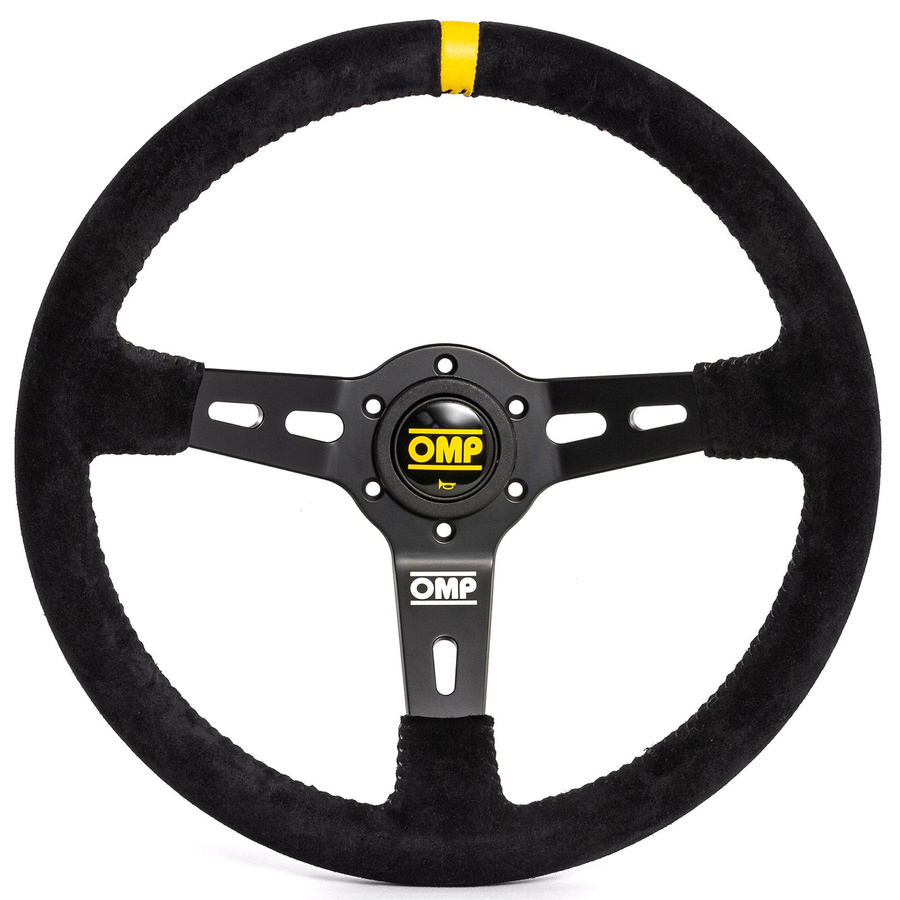 Het nieuwste model OMP rallystuurwiel. Ontworpen voor de motorsport. Armen van aluminium. Dikke suède grip zorgt voor een zeer goede grip. Het heeft een gele streep en zwarte naden.