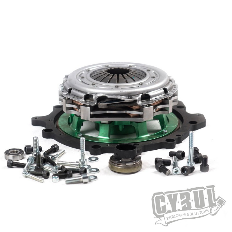 De kit bevat CNC-gefreesd Vliegwiel met kroonwiel en zwevende plaat, 2 gesinterde platen, drukgroep, versnellingsbakadapter, druklager en as centreer lager en een set bouten en moeren.